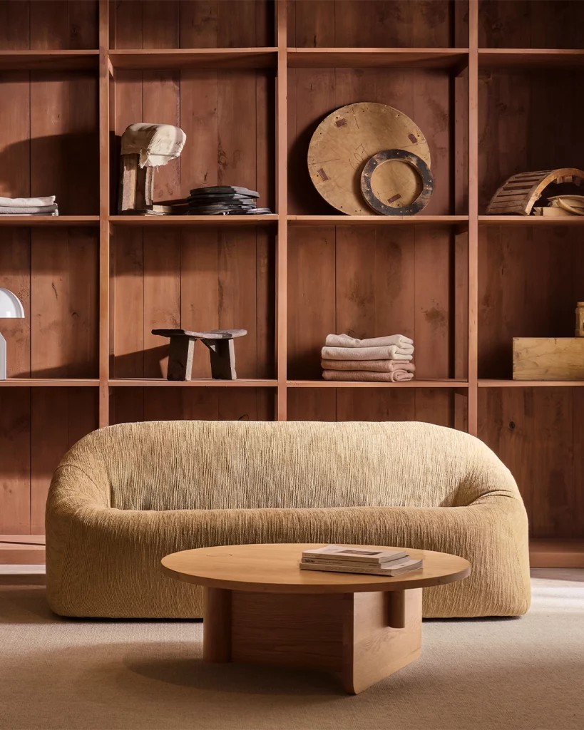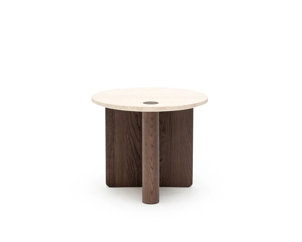 A half-length timber dowel at the end of the table nicely mirrors the large cylindrical leg.