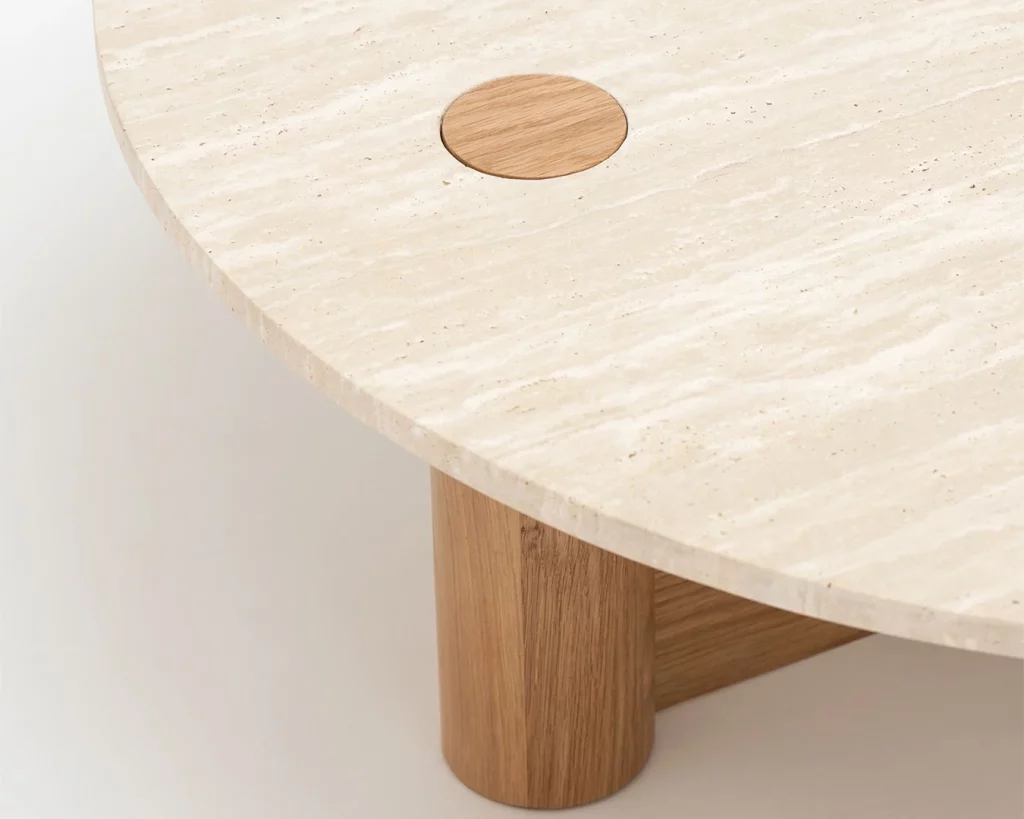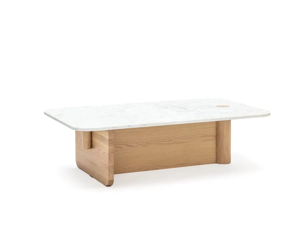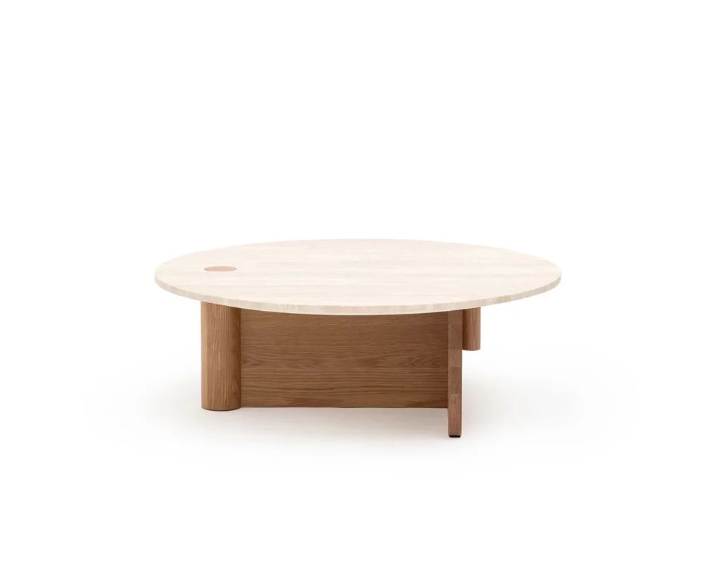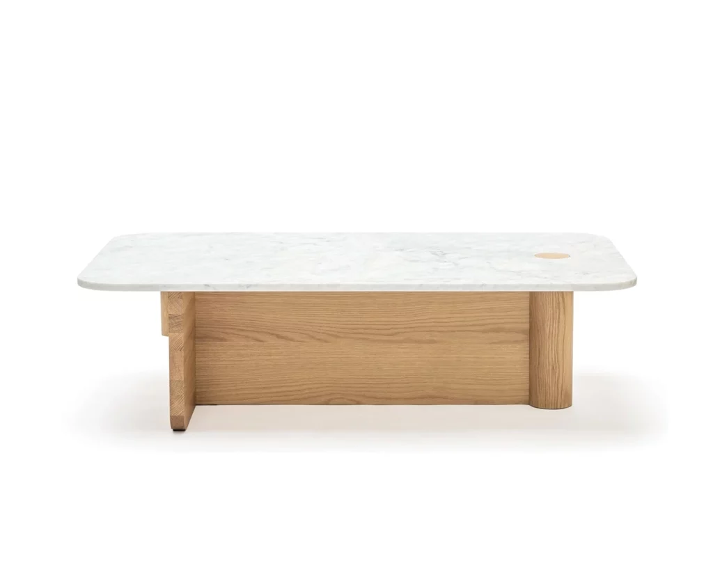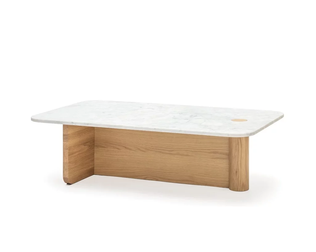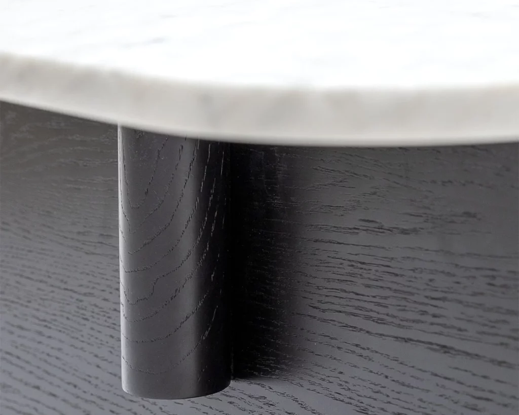 The Pivot coffee table features a solid wood dowel which meets a t-frame, providing contrast between the cylindrical and flat surfaces. The dowel also makes its way through to the table top, creating a beautiful link and adding stunning detail to the honed marble.