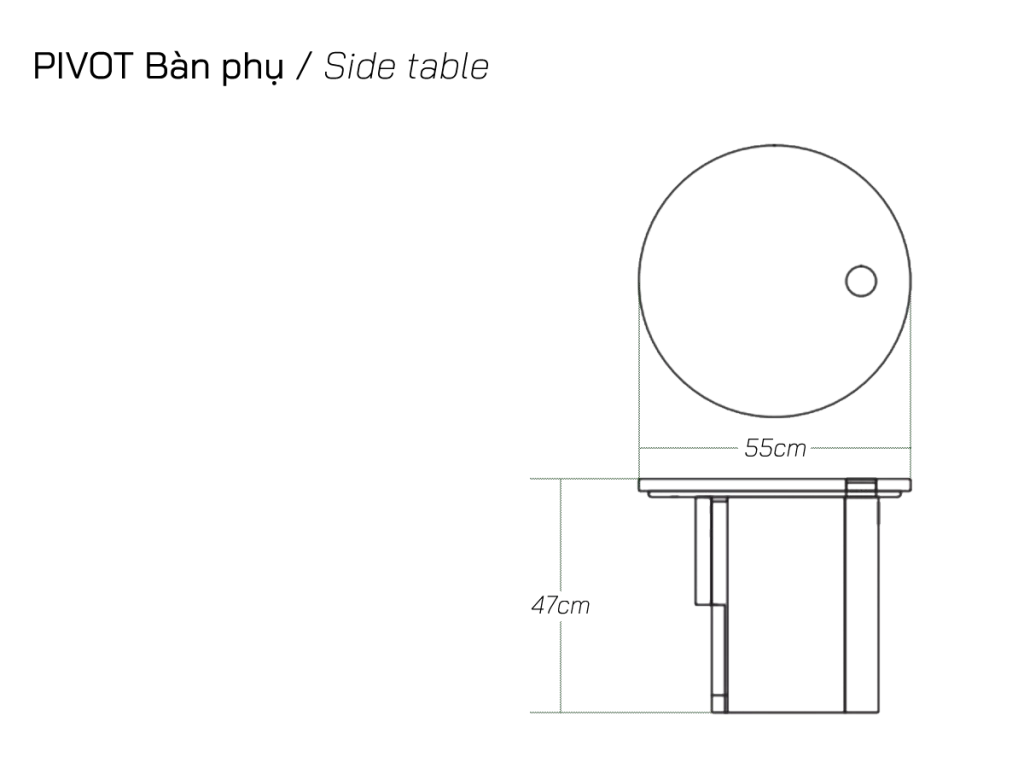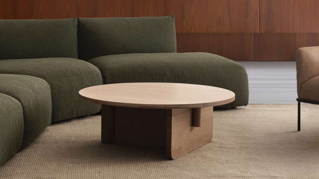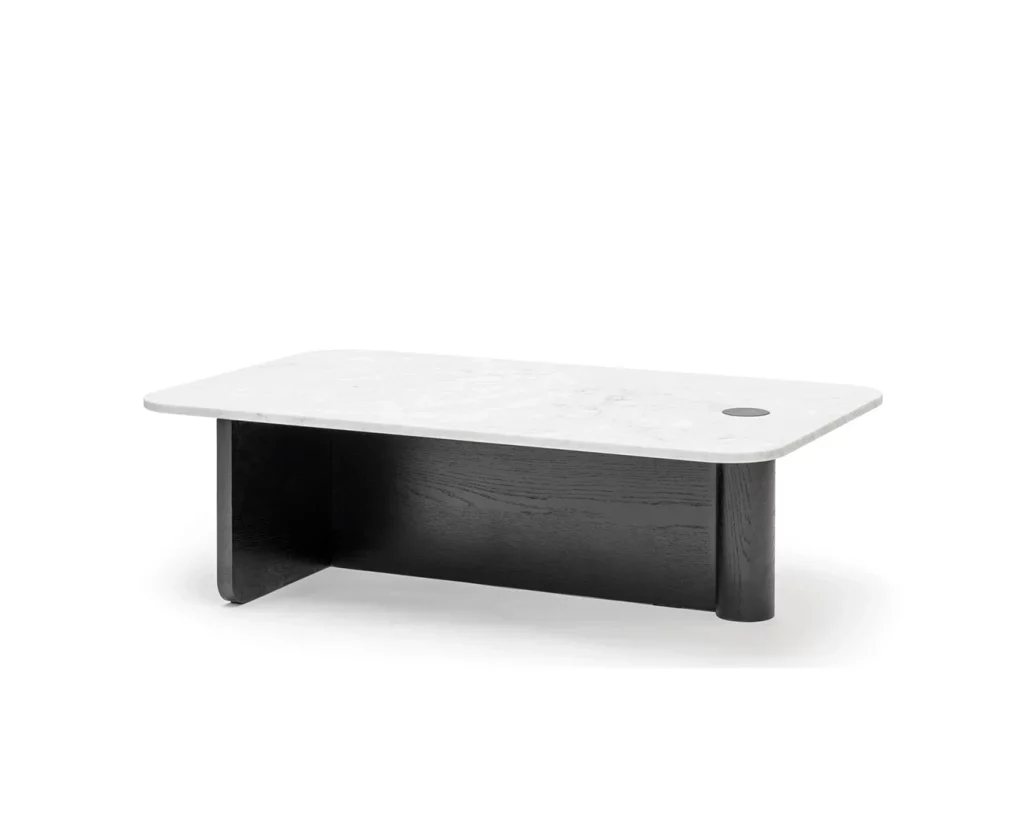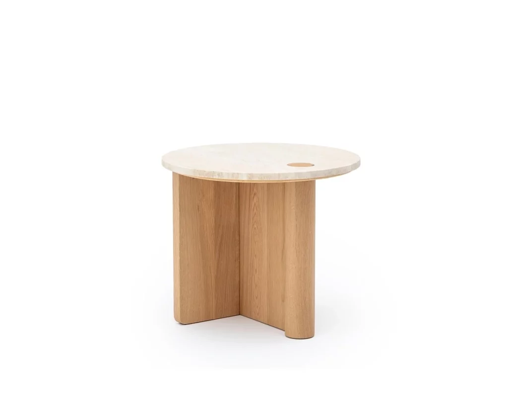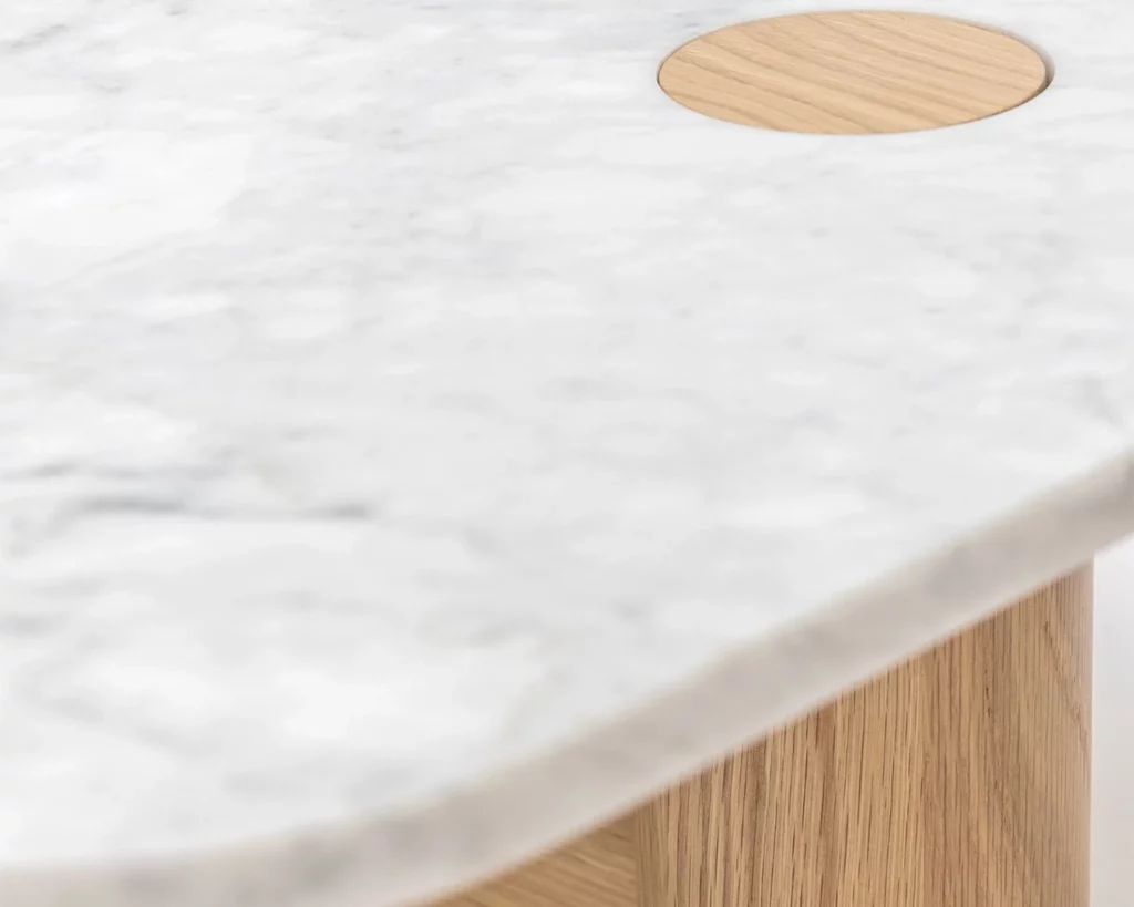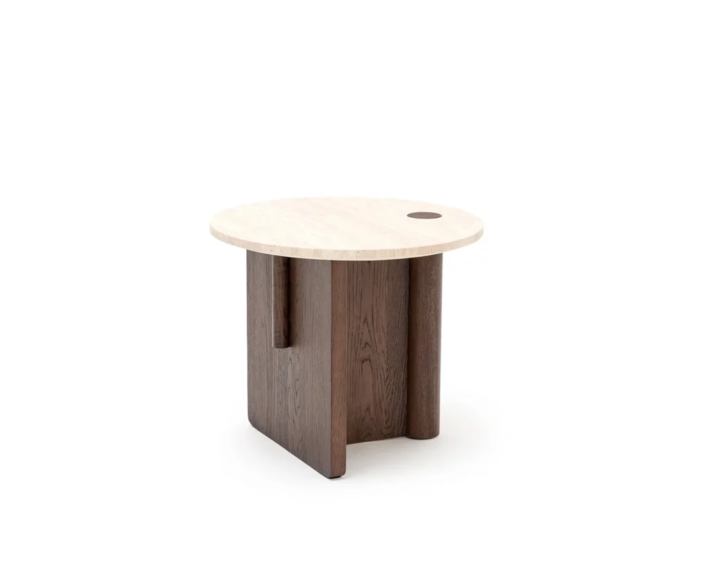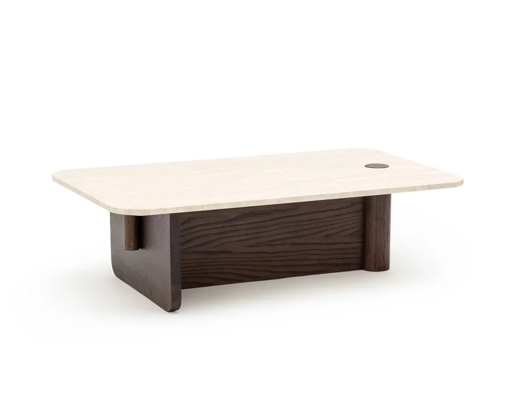 The Pivot coffee table features a solid wood dowel which meets a t-frame, providing contrast between the cylindrical and flat surfaces. The dowel also makes its way through to the table top, creating a beautiful link and adding stunning detail to the honed marble.