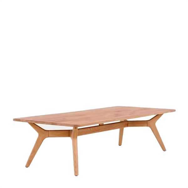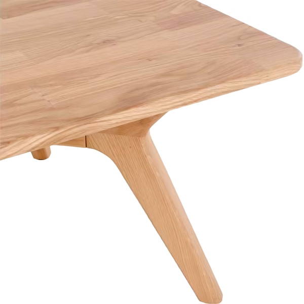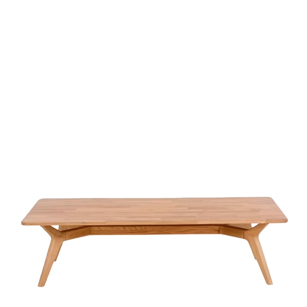 Chiếc bàn trà chữ nhật được chế tác từ gỗ sồi nguyên khối với màu tự nhiên, kết hợp chân thiết kế tinh tế mang đến vẻ hiện đại và sang trọng/A sleek rectangular coffee table crafted from solid oak in a natural finish, featuring stylishly designed feet for a modern, elegant look.