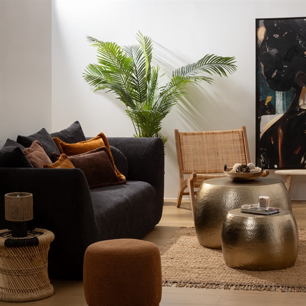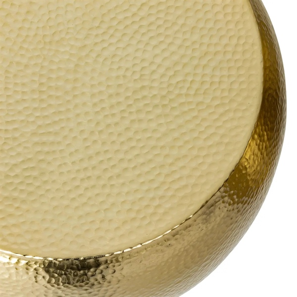 Chiếc bàn trà nổi bật bằng kim loại màu vàng với bề mặt dập nổi, mang những chi tiết lấy cảm hứng từ phong cách phương Đông, tạo điểm nhấn tinh tế và độc đáo/ A striking coffee table in gold metal with a hammered finish, featuring elegant oriental-inspired details for a sophisticated, exotic touch.