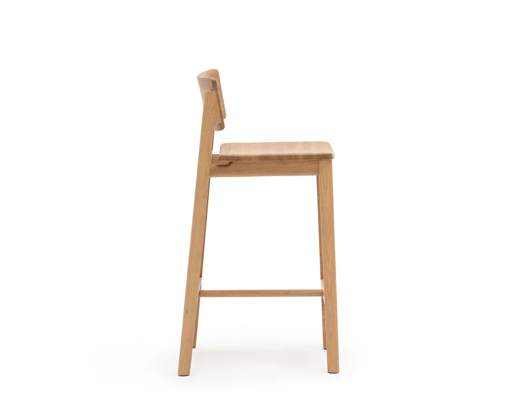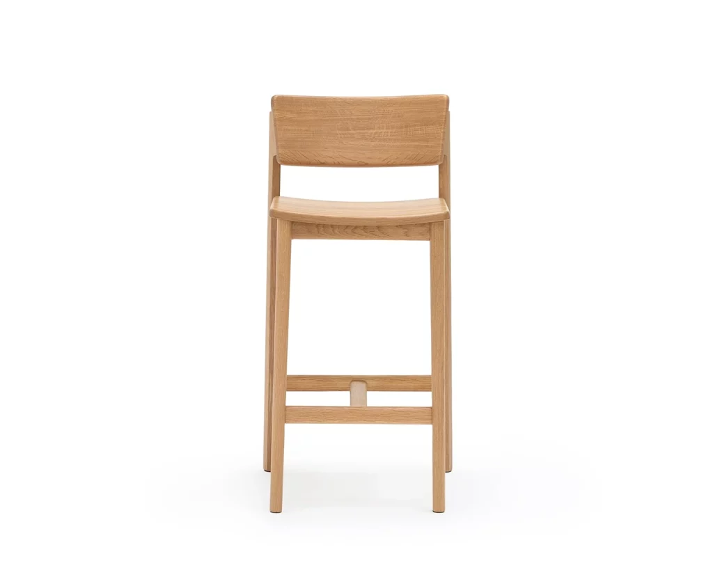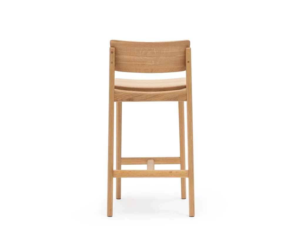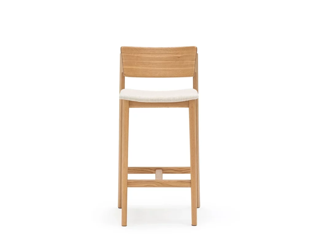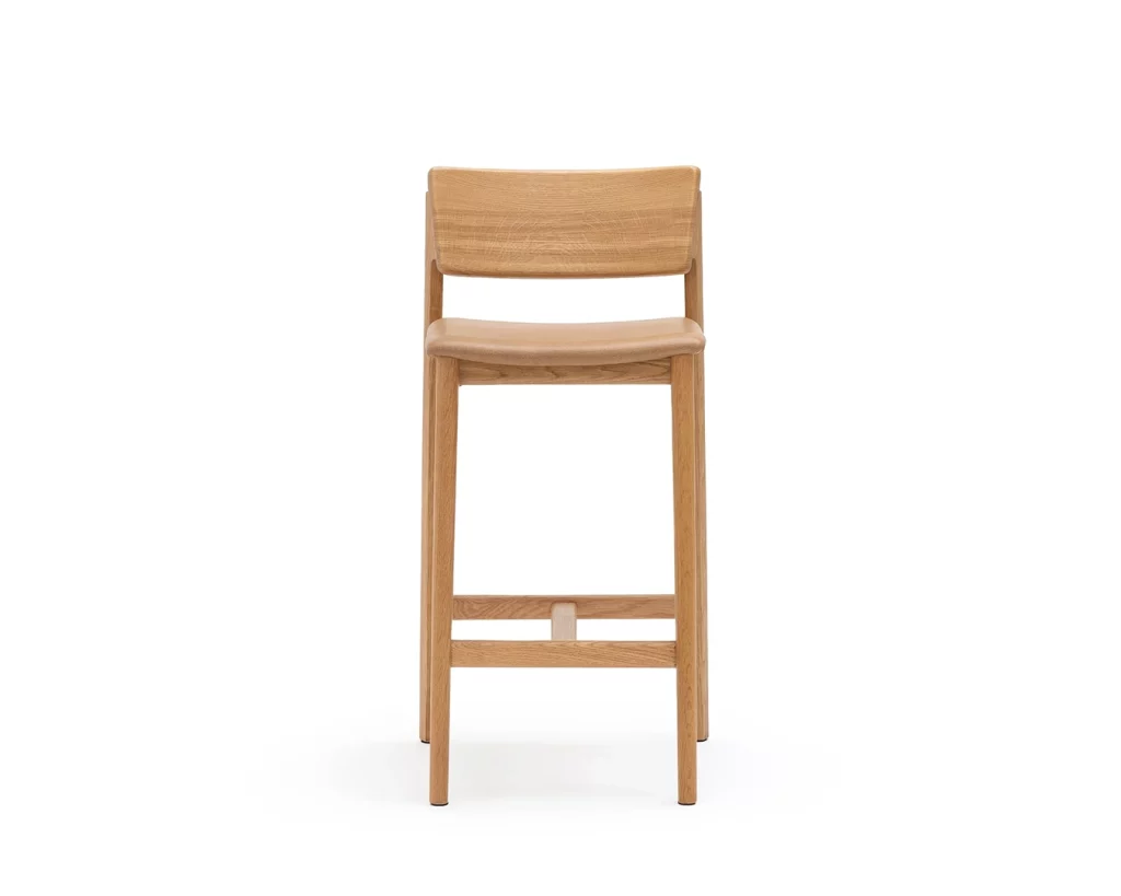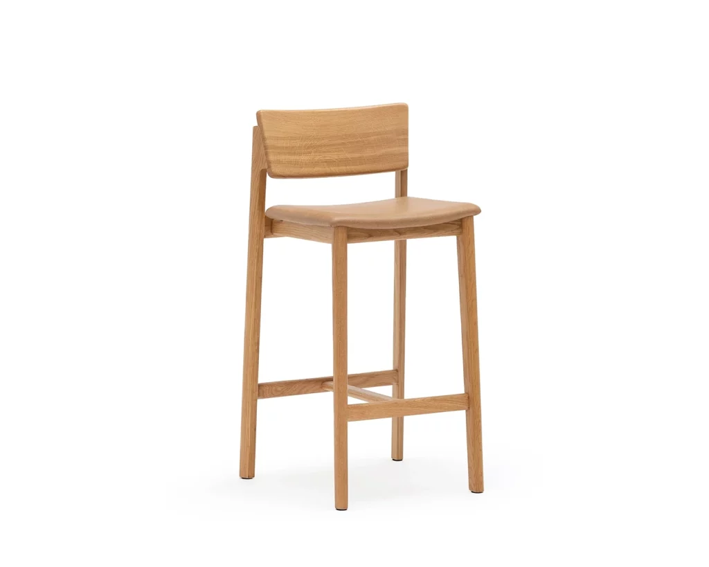 Poise stool is offered in both counter height and bar height, both with a choice of either solid oak seat, or upholstered seat.