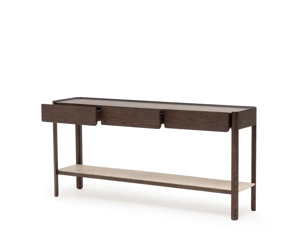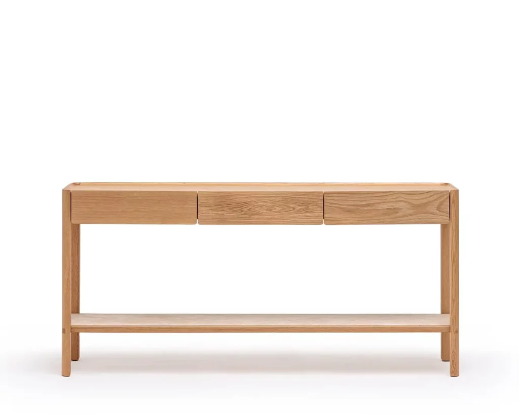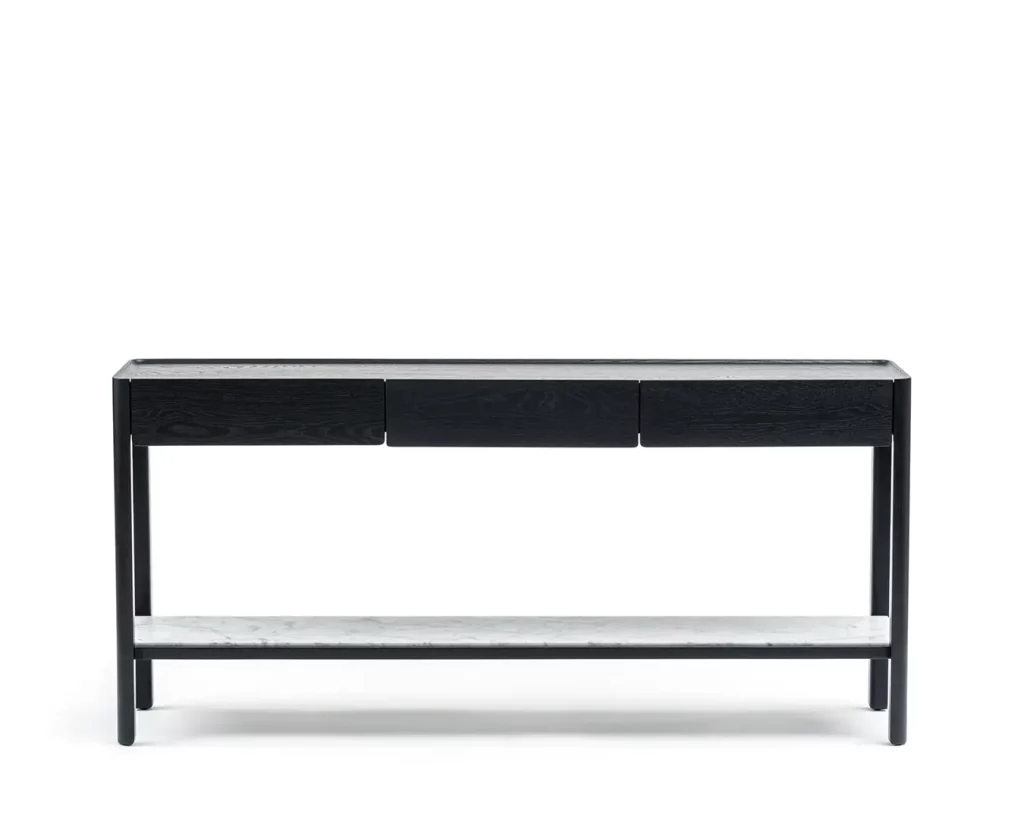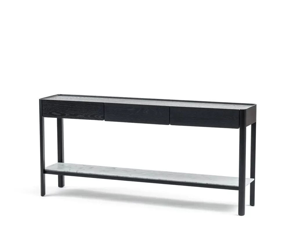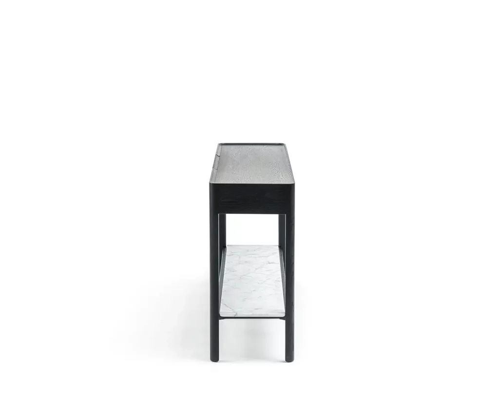 Nell Console is a composition of harmonious details that together form a unique statement piece. Each element invites attention and tactile interaction. The scalloped top shelf provides a safe storage surface, while the front edge opens convenient drawers. Braced with a marble or timber shelf.
