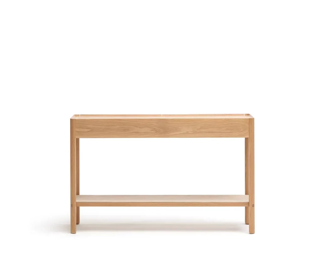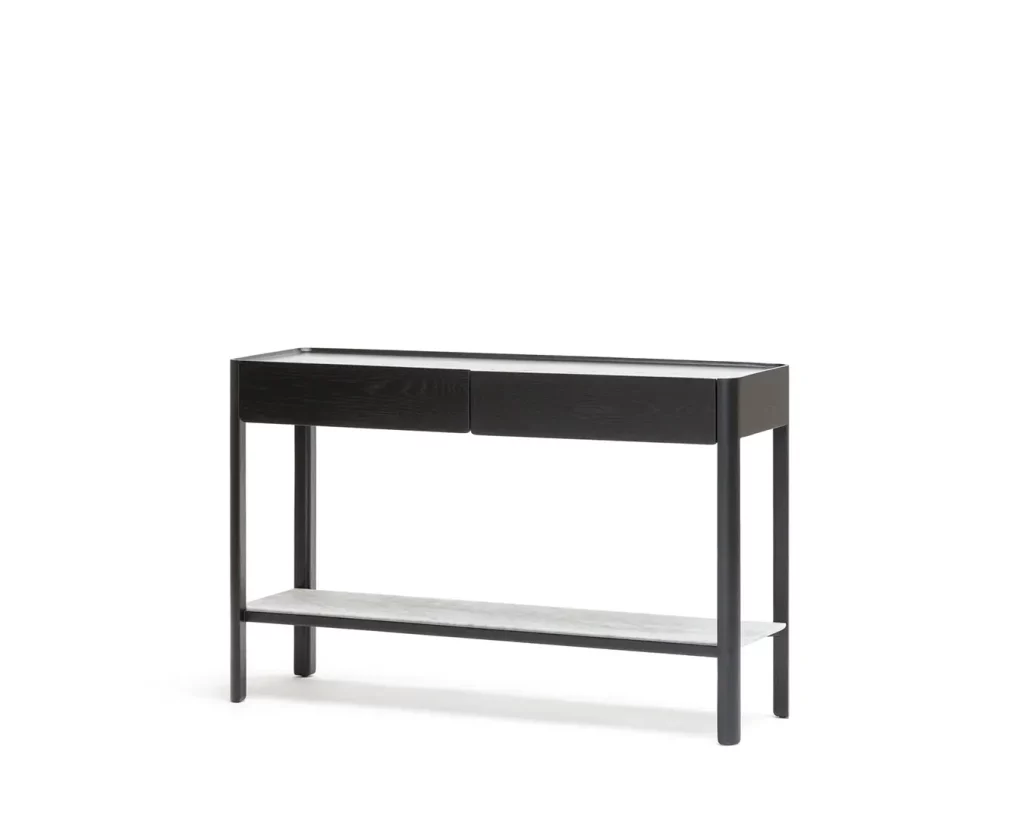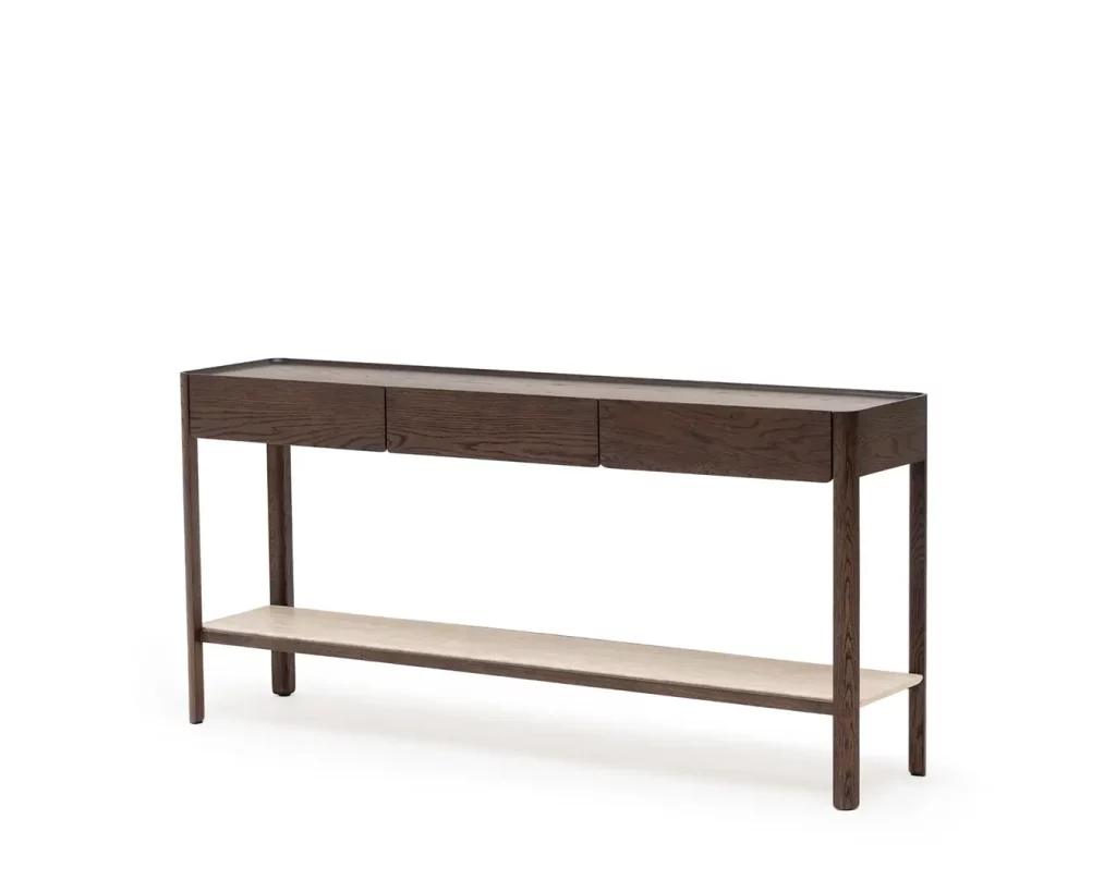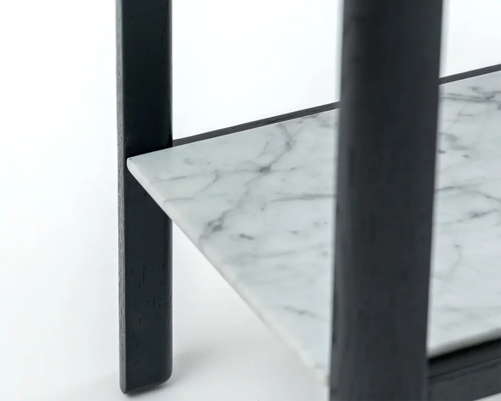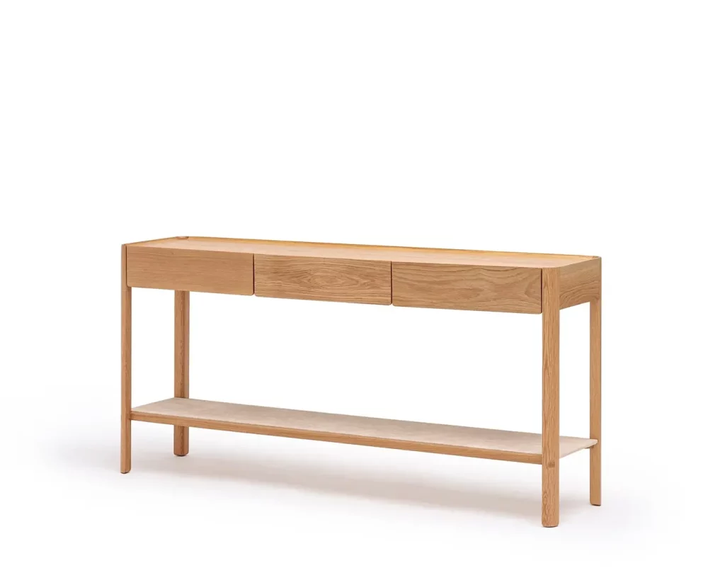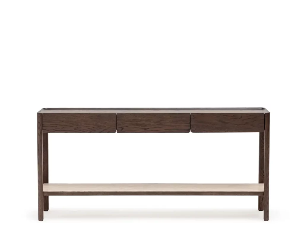 Nell Console is a composition of harmonious details that together form a unique statement piece. Each element invites attention and tactile interaction. The scalloped top shelf provides a safe storage surface, while the front edge opens convenient drawers. Braced with a marble or timber shelf.