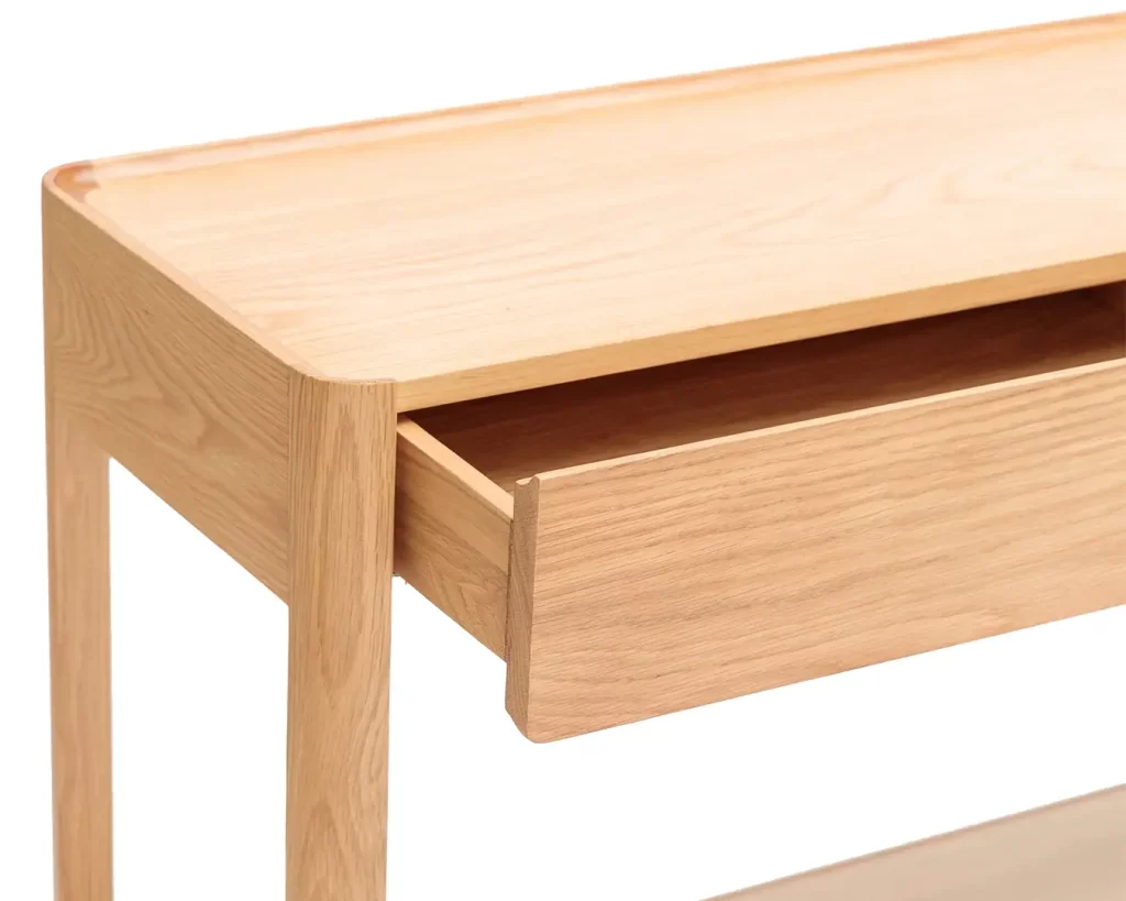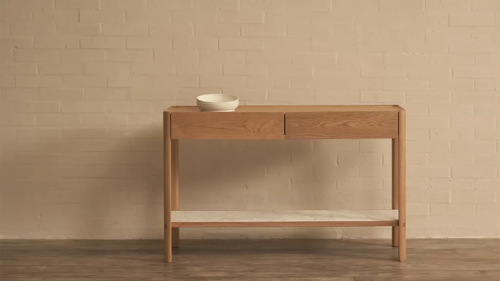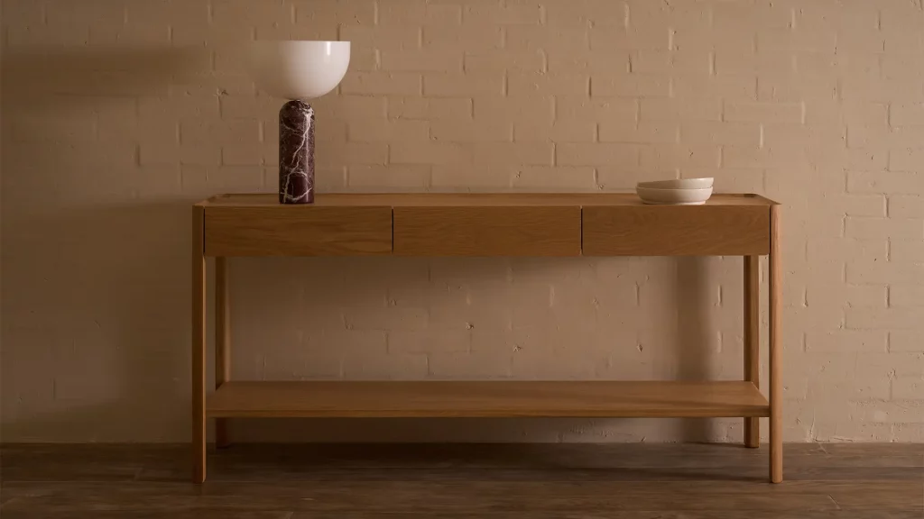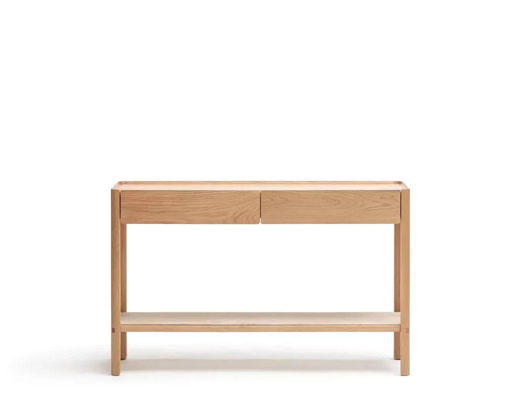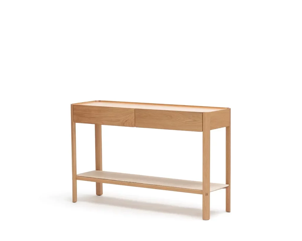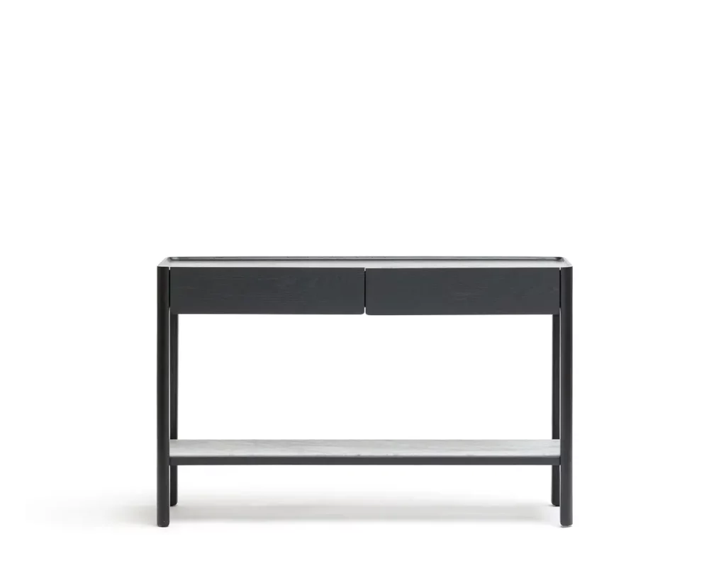 Nell Console is a composition of harmonious details that together form a unique statement piece. Each element invites attention and tactile interaction. The scalloped top shelf provides a safe storage surface, while the front edge opens convenient drawers. Braced with a marble or timber shelf.