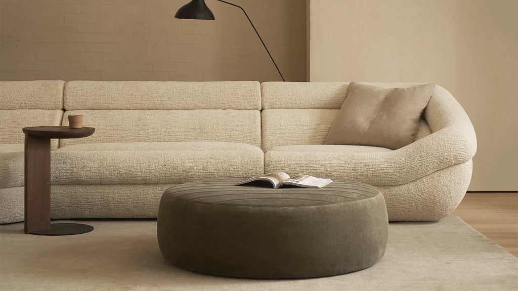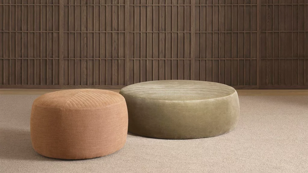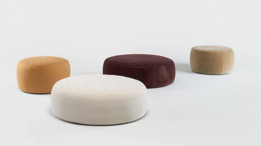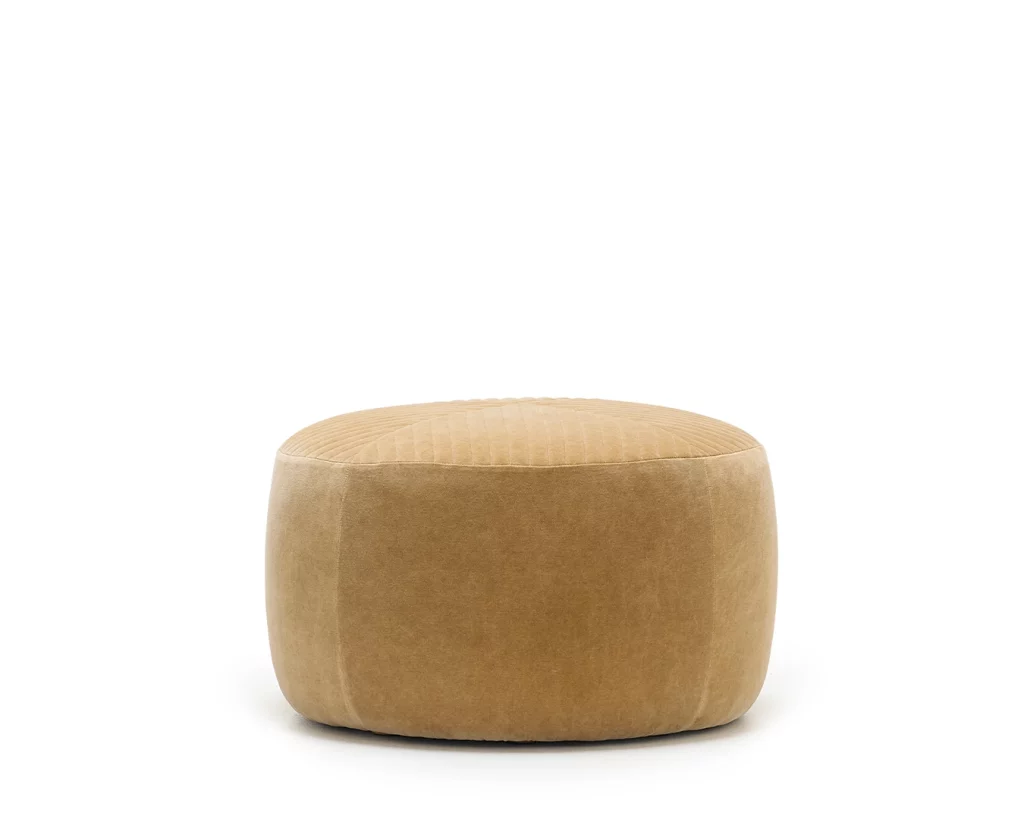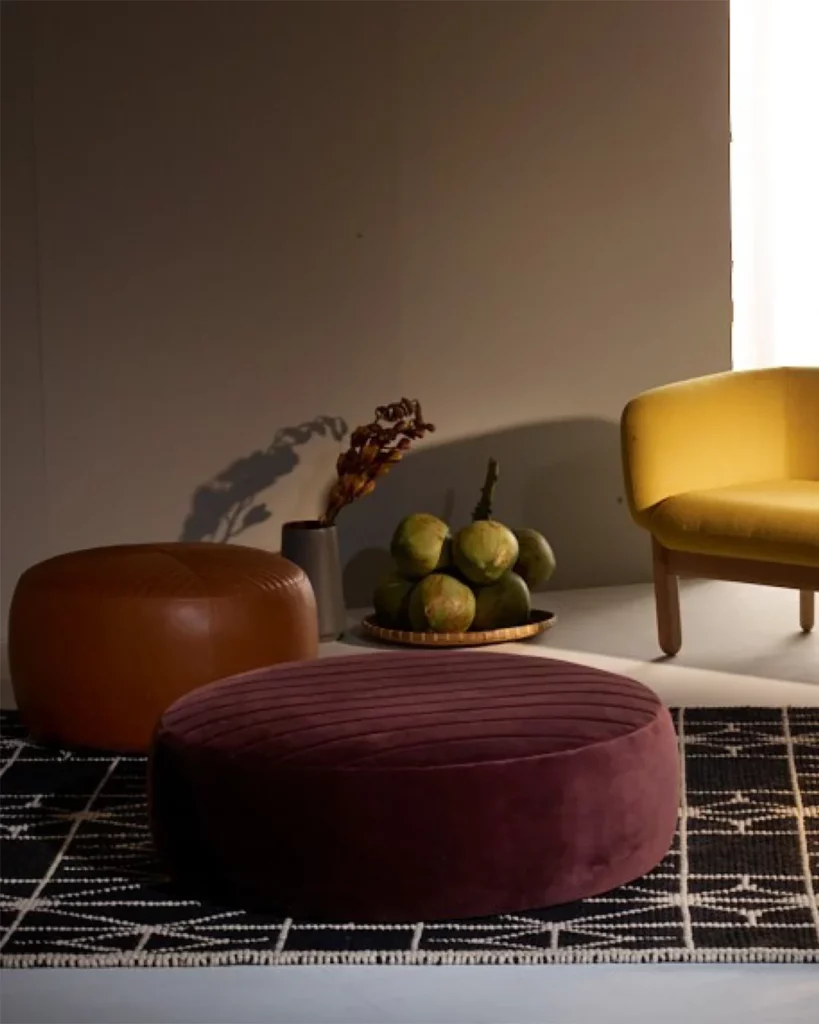 Manchego and Brie form the Fromage collection of pouffes, which have quilted tops in varying textures. As the name suggests, Mentsen designed these plush and characterful pouffes with cheese wheels in mind.
