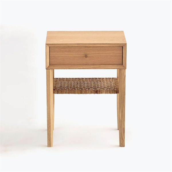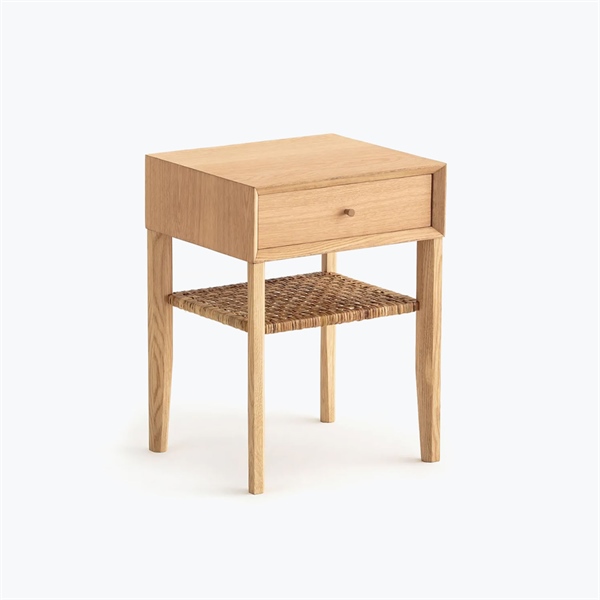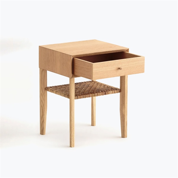 Chiếc bàn trợ gỗ sồi với chân gỗ sồi chắc chắn, một ngăn kéo và kệ mây, kết hợp các chất liệu tự nhiên với không gian lưu trữ tiện dụng/ A charming oak side table with solid oak legs, one drawer, and a rattan shelf, combining natural textures and practical storage.