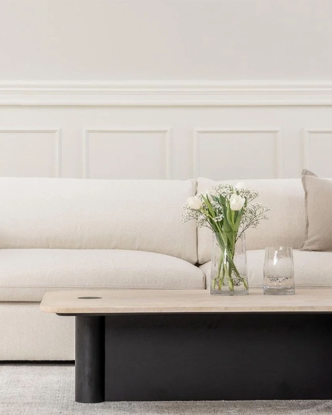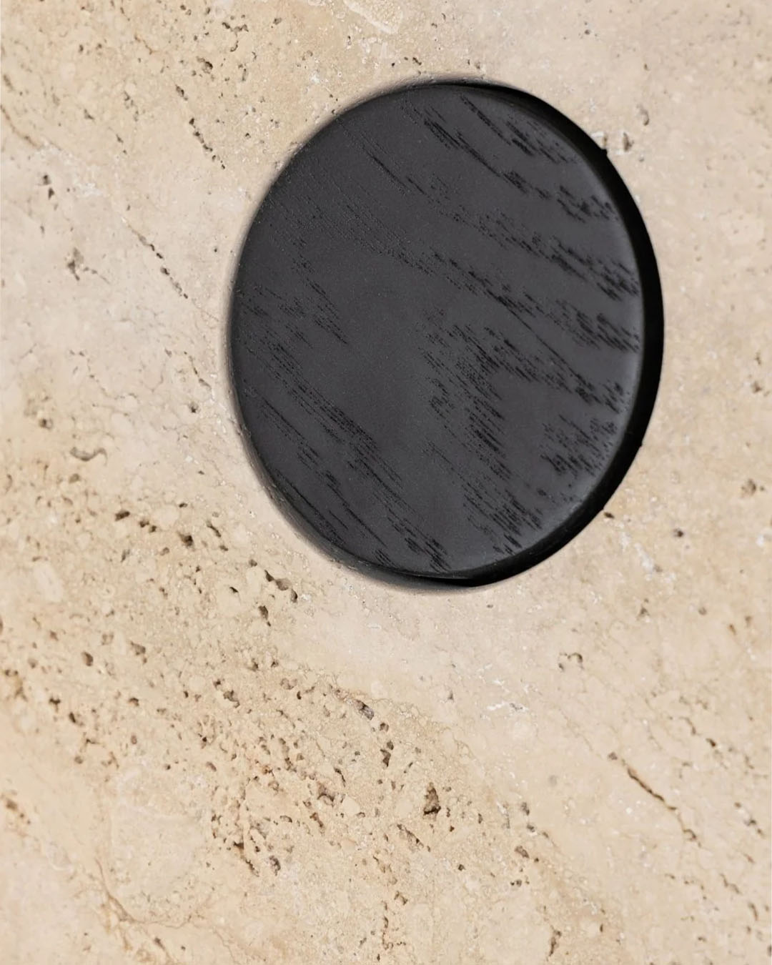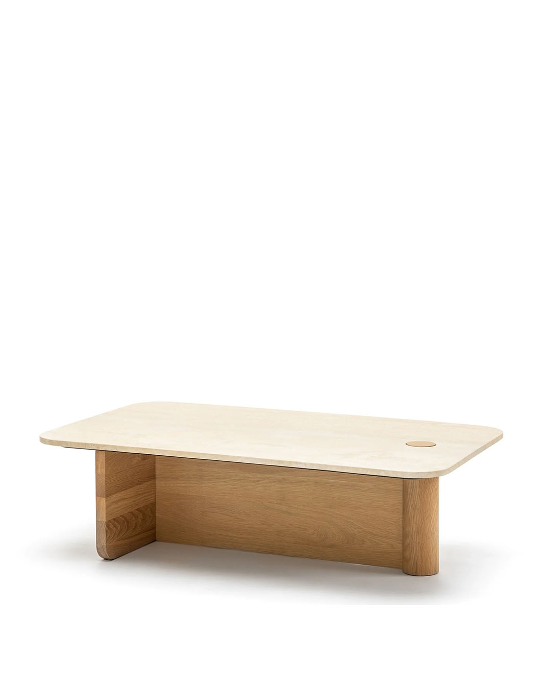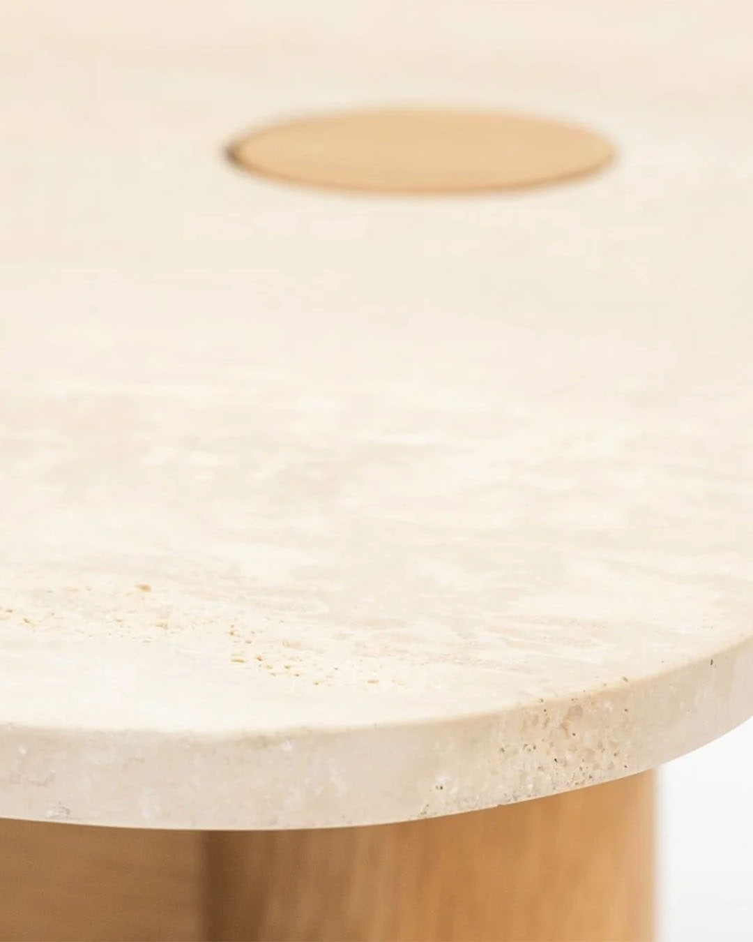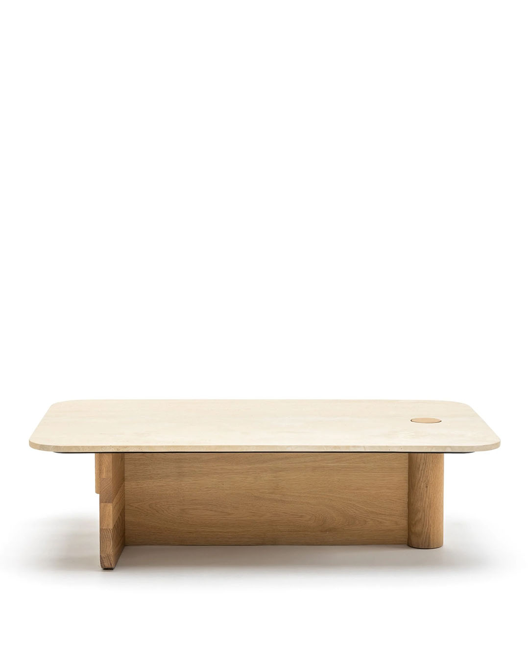 Bàn trà Pivot nổi bật với thanh gỗ tròn đặc nối liền khung hình chữ T, tạo nên sự tương phản tinh tế giữa bề mặt trụ tròn và phẳng. Thanh gỗ này còn xuyên qua mặt bàn, tạo nên điểm liên kết hài hòa và chi tiết nổi bật trên lớp đá cẩm thạch được mài nhẵn. Một đoạn ngắn của thanh gỗ ở đầu bàn phản chiếu hoàn hảo hình dáng của chân trụ lớn, mang lại tổng thể cân đối và tinh tế/ The Pivot coffee table features a solid wood dowel which meets a t-frame, providing contrast between the cylindrical and flat surfaces. The dowel also makes its way through to the table top creating a beautiful link and adding stunning detail to the honed marble. A half length of timber dowel at the end of the table nicely mirrors the large cylindrical leg.