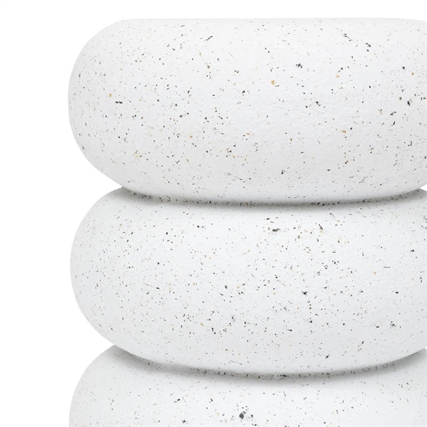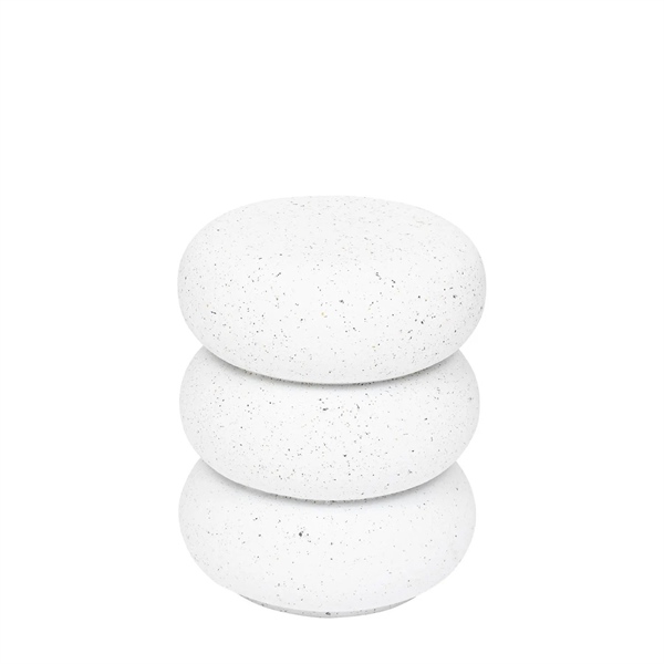 Bàn Trợ kết hợp thiết kế tự nhiên với lớp hoàn thiện hiệu ứng terrazzo thanh lịch. Được tạo thành từ ba khối tròn xếp chồng, bàn được làm từ oxit magie màu trắng — một vật liệu tự nhiên giống gốm nhưng nhẹ hơn/ This side table combines organic design with an elegant terrazzo-effect finish. Composed of three stacked round elements, it is made from white magnesium oxide, anatural material similar to ceramic but lighter.