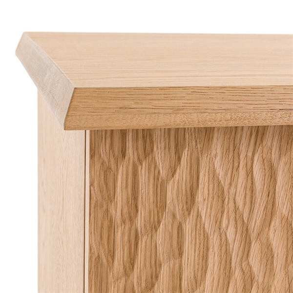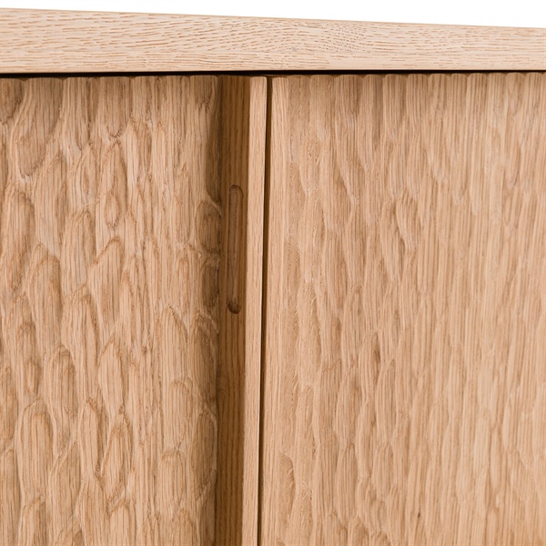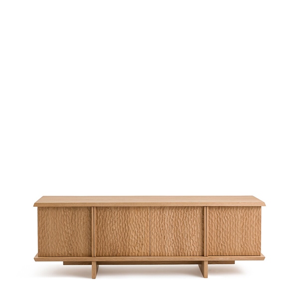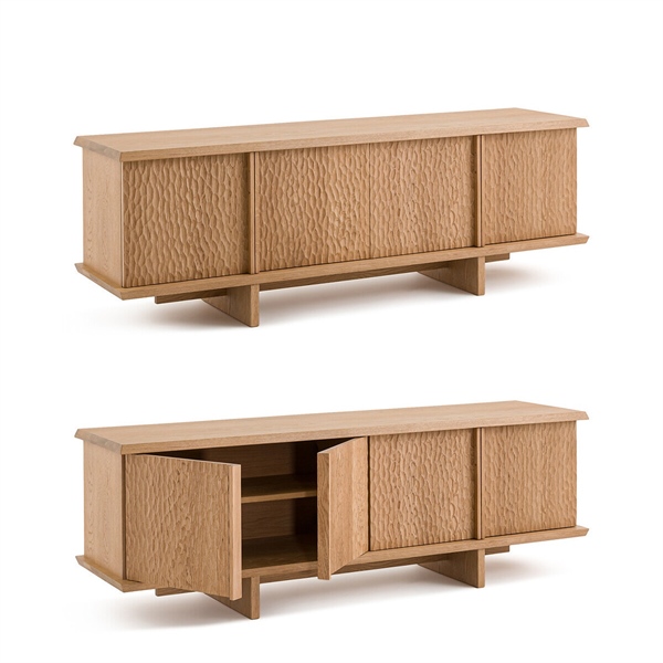 Mặt bàn vát cạnh, thanh giằng trung tâm và chân bàn lồng ghép — tất cả đều là những đặc trưng tạo nên thiết kế hiện đại nhưng vượt thời gian của sản phẩm. Họa tiết nổi trên bốn cánh cửa gợi nhớ đến hiệu ứng điêu khắc được tạo ra bởi chiếc đục gỗ mà các nghệ nhân mộc thường sử dụng/ Simple and refined, the Tisal TV stand combines contemporary spirit with traditional craftsmanship.Beveled tops, a central crossbar, and interlocking legs — all key features that define its modern yet timeless design. The textured detail on the four doors evokes the sculpted effect created by a gouge, a tool used by master cabinetmakers.